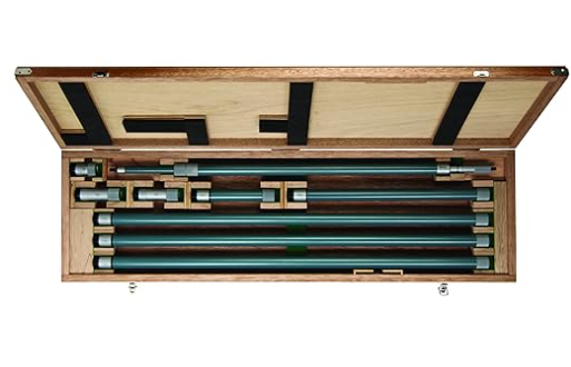 The Mitutoyo 140-159 Series 140 is a tubular, vernier inside micrometer that uses extension pipes to measure large internal diameters. The set has a wide measurement range and comes in a wooden case.