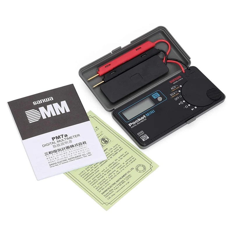 DescriptionThe Sanwa PM7a is a pocket-sized digital multimeter known for its unique folding design with a built-in protective case. This design allows it to be carried easily and stored safely in a pocket, similar to a flip phone. It is intended for measuring weak current circuits in applications like small communications equipment and home appliances. |