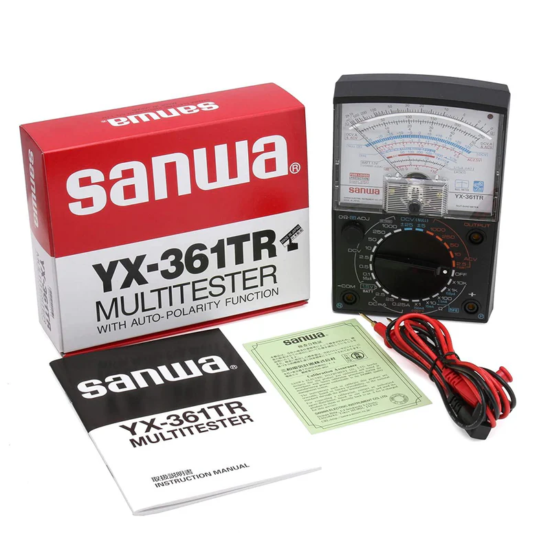 Key FeaturesAnalog display: Uses a needle and scale for measurement readouts. Zero-center meter: A feature for measuring ±DCV (positive and negative DC voltage) with the indicator in the center of the scale. Output terminal: Includes a series capacitor terminal, useful for measuring only the AC portion of a signal that contains both AC and DC. Safety and durability: The instrument's circuitry is protected by a replaceable 250V/0.5A glass fuse. The hard plastic body protects the device from environmental wear and tear. Power source: Uses two 1.5V AA batteries and one 9V battery. Measurement functions: Includes a wide range of capabilities: 1. DC Voltage: Up to 1000V. 2. AC Voltage: Up to 1000V. 3. DC Current: Up to 0.25A. 4. Resistance: Measures up to 20MΩ. 5. dB measurement: Measures signal power in the range of -10dB to +62dB. 6. hFE (Transistor gain): Provides measurement for transistors. 7. Continuity check: An LED indicates electrical conduction. 8. Battery check: Assesses the remaining charge of batteries.